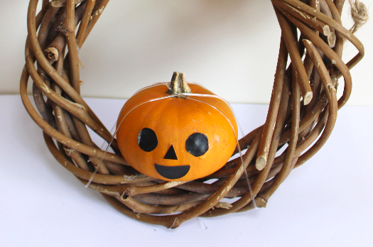 こうやってかぼちゃを留めたリースを、壁にかけてみました。